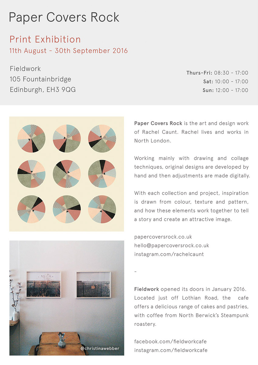 In 2016, Rachel exhibited a collection of prints in Fieldwork, a beautiful café located just off Edinburgh’s Lothian Road. The collection of artwork sat perfectly alongside the rustic wooden furniture and exposed brickwork. The exhibition coincided with the busy and vibrant Edinburgh Festival.