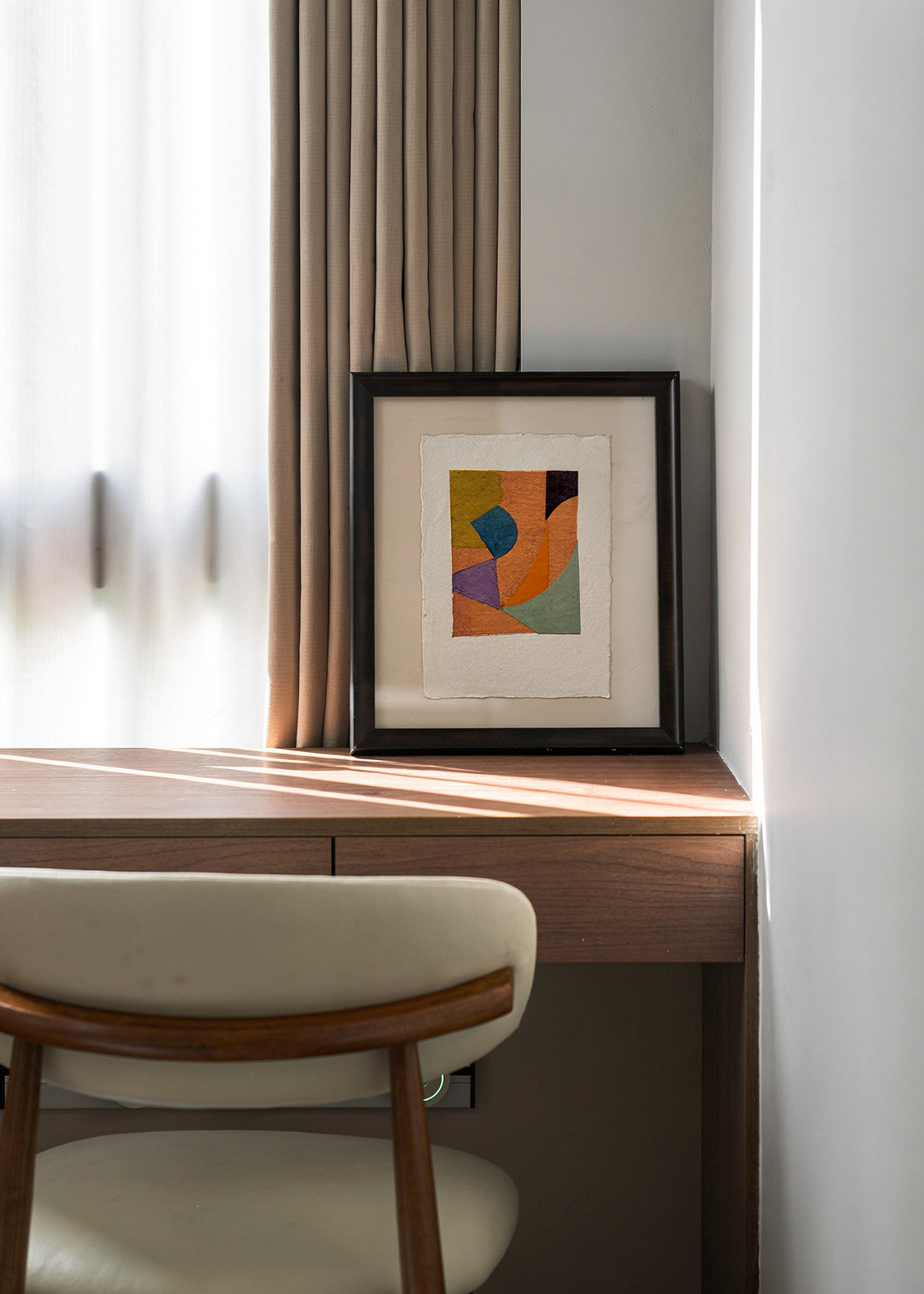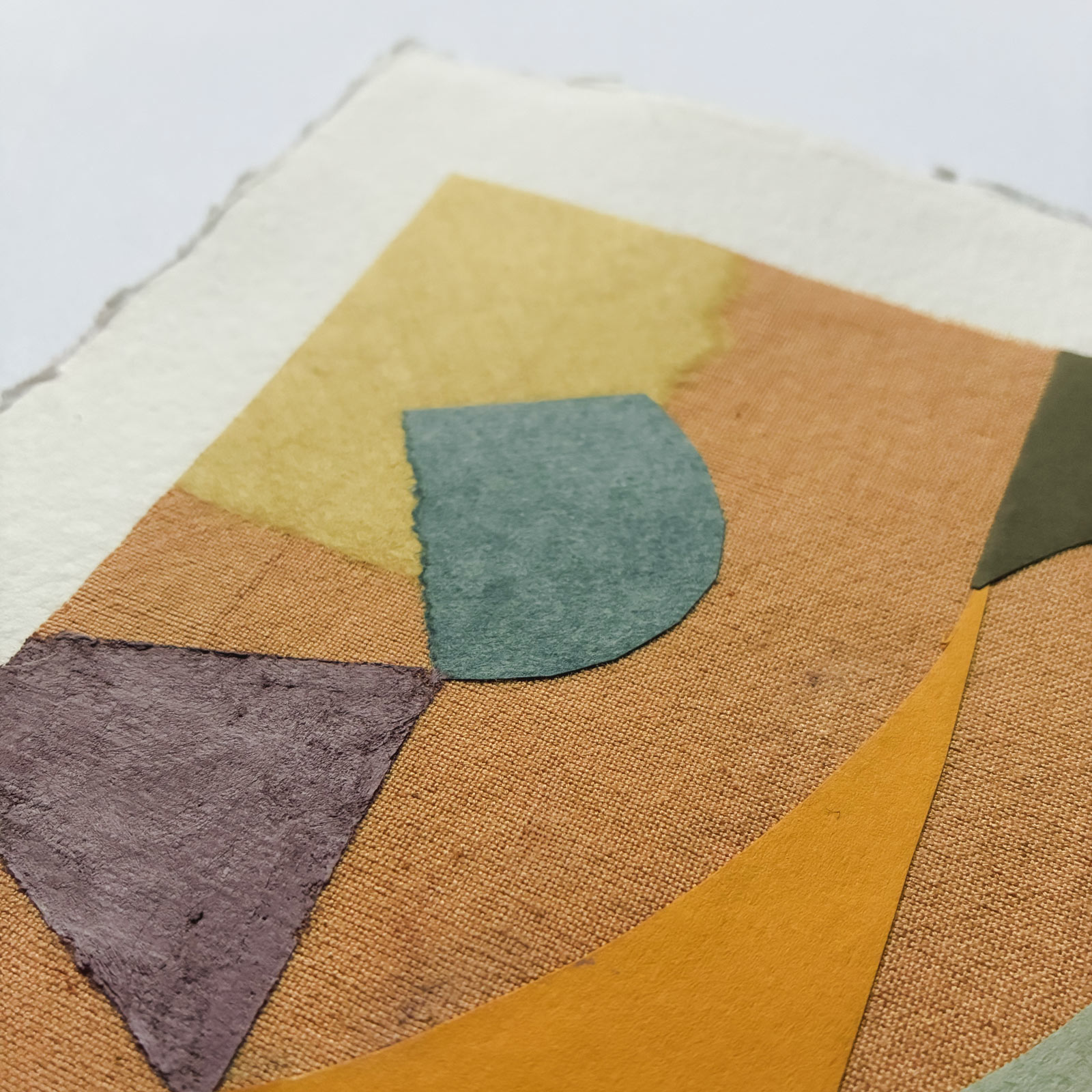 This original artwork is part of an ongoing collection of small collages made from a combination of naturally dyed fabrics, a variety of papers and oil pastel. Each design starts with a colour palette and then a composition is created carefully balancing the shapes, textures and colours.