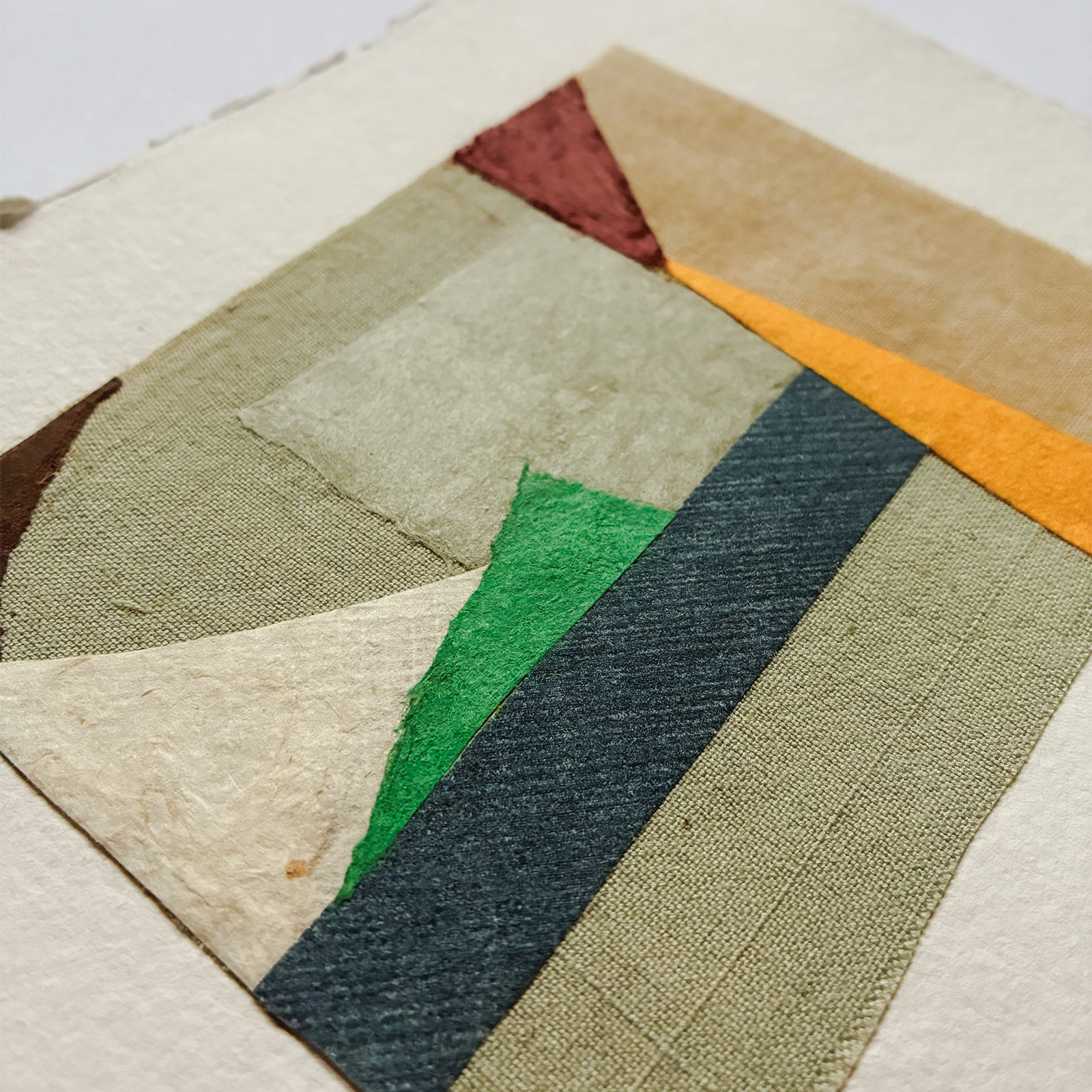 This original artwork is part of an ongoing collection of small collages made from a combination of naturally dyed fabrics, a variety of papers and oil pastel. Each design starts with a colour palette and then a composition is created carefully balancing the shapes, textures and colours.
