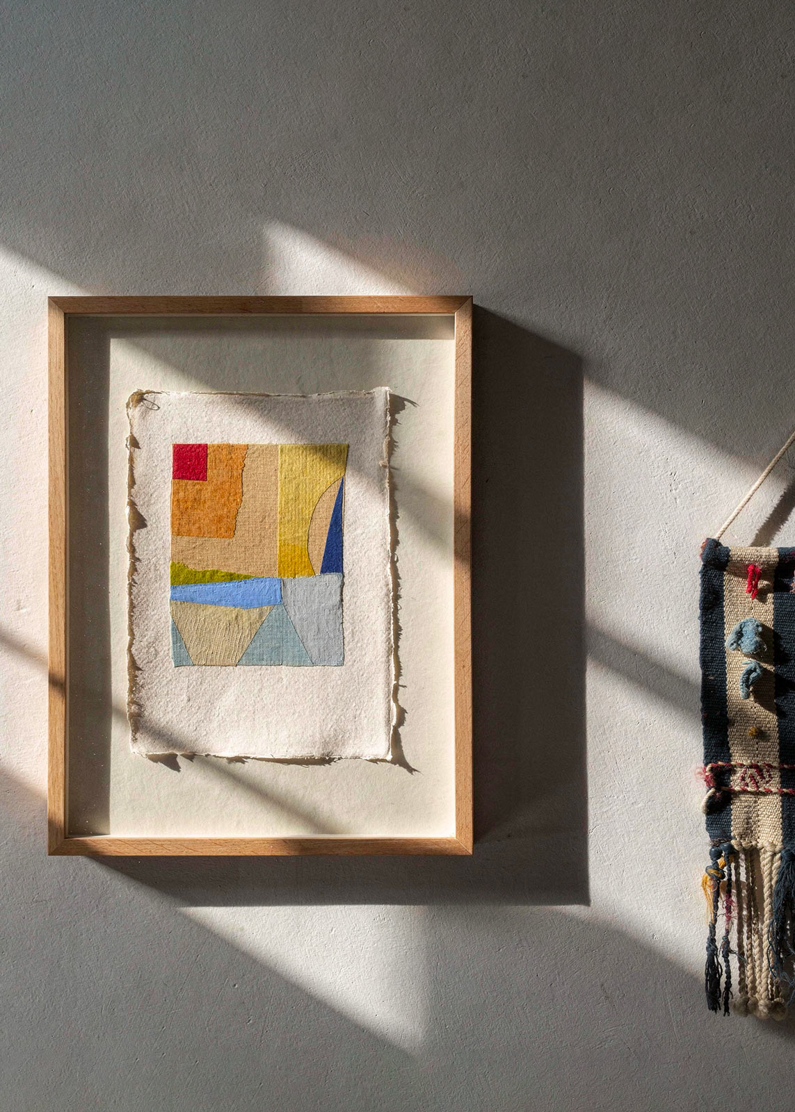This original artwork is part of an ongoing collection of small collages made from a combination of naturally dyed fabrics, a variety of papers and oil pastel. Each design starts with a colour palette and then a composition is created carefully balancing the shapes, textures and colours.