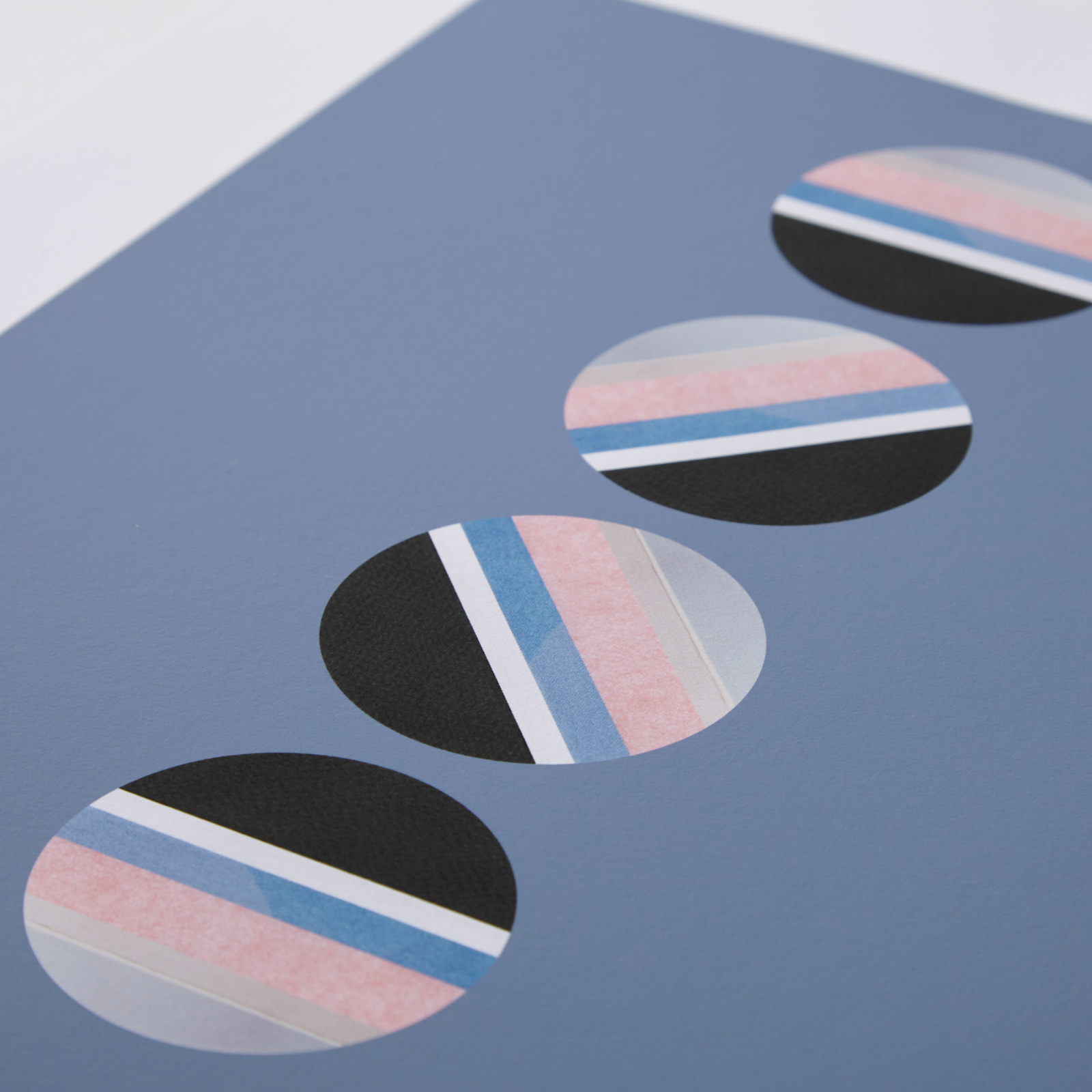 ‘Rotation’ has always been a best seller! It is a study of colour, shape and texture and how these elements can be carefully combined to create a design that is well-balanced and visually effective. The gentle cornflower blue background succeeds in being both subtle and striking.